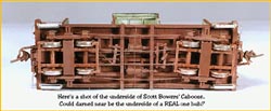 A Short History By John Hugh Coker The Short Cabeese were most often relegated to branch line service and short trips.. Perhaps this came about because of their diminutive size? Might be.. Maybe it was because they "looked right" behind the small 2-8-0 "C" class locos the branch lines favored.. (Many photos depicting the #361 in the "Black Canyon of the Gunnison" show her with a short caboose in tow..) But photos also reveal that at least one was used on the "Gunbarrel" between Poncha Springs and Alamosa, being pulled behind the likes of "480's" and "490's," all the way up into the fifties... Although they were "Real Chummy" inside, they garnered much favor with the crews that worked and lived in them because they were easy to heat.. A real consideration given the elevations they were to be found traversing! An interesting bit of trivia In the old times, an Engineer would be assigned to one particular locomotive. It was "his" to keep and care for, and this showed in how well kept these locomotives were, as can be seen by examining early photos. But this all ended with the advent such things as "reorganization" and "engine pools.." Not so the caboose.. The cabooses were never "pooled." At least on the D&RG, anyway,, Each caboose was assigned to a specific conductor, FOR LIFE! Old conductors, like Alvie Lyons and Myron Henry literally spent most of their lives in these "Office" cars, which ended up being their "home away from home.." The conductor would generally decorate the inside to suit himself.. Which is one reason there was so much variation between the prototypes. Many short cabooses had the dubious honor of being the very last car to run on a particular very last train, with the last of the shorties being retired in 1953... Survivors include #0500 and #0501, on the Durango line today; #0524 and #0578 at the Colorado RR'd Museum in Golden; #0573 in Ogden Utah; and #0579 now at the C&TS RR'd. These interesting cars can almost be described as "the epitome" of the narrow gauge.. They just have "that look and feel" that kind of tells it all. . . ( You can visit John's web site and read more about him by Clicking Here. . . ) These models have an accurately scaled, complete interior in them. Even sliding cupola windows! Decals and Genuine Kadee ® Couplers are included, of course, along with a comprehensive instruction "manual" and "hints" to ensure that your model can end up looking like the one shown above... Kit comes complete with 3'-7" Arch Bar Trucks ( See Cameo Below); plus correct Decals for building the model either as a 1930's or a 1940's era car. Plus we include Genuine Kadee ® Couplers. Click on the icons above for other enlarged photos of our Short Caboose.