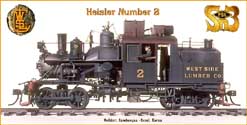 It might be said that Shay's only real threat came from the Heisler, manufactured by the "Stearns Manufacturing Co. of Erie Pennsylvania. And although the Climax never put much of a dent in the sales of the Shay locomotives, it's design, and surprisingly, that of the Heisler were both patented by the same fellow, a Mr. George Gilbert. The first true Heisler bearing that name appeared in August of 1894. The prototypes of the models seen on these pages, Westside Lumber Company's #2 and #3 rolled out of Stearn's Erie plant only a few years thereafter: 1899 and 1900 respectively. And, unbelievable as it may seem, both survive to this day! #2 in rather shoddy condition in the "Tuolumne City Park" in Tuolumne California; #3 in magnificently restored, fully operating condition in Felton California where she is operated on a regular basis on the 6% (and greater) grades of the RC&BT RR'd! Not too bad for a 100 year old, eh? "How'd they run" you ask? Well sir, anybody who's seen our traveling display layout "Chama" in operation in the past several years has probably witnessed our #3 in operation. I'm sure these guys will attest to the fact that these little rascals REALLY RUN! As in Smoothly, Powerfully and Prototypically. With scale top speeds in the low "teens" there's just no stopping 'em! An excerpt from the newsletter we sent out on them in 1994 read: